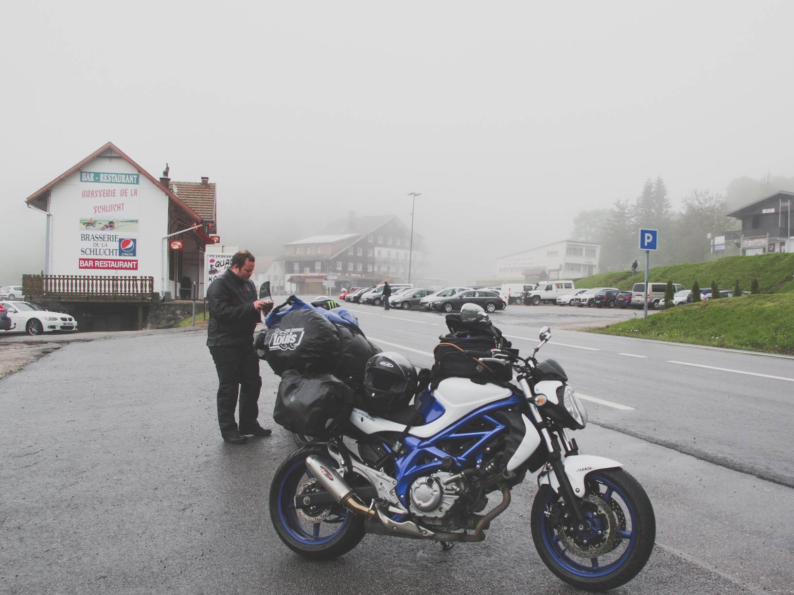 Die Route geht bis Memmingen über die Autobahn und dann zum Donautal. Ab Sigmaringen wird es immer kurviger. Mittags kehren wir im Brauereigasthaus von Tannenzäpfle in Rothaus ein. Ganz große Empfehlung. Weiter geht es durch den Schwarzwald und was soll man dazu noch sagen? Geil! Das Rheintal überwinden wir via Autobahn, die erstaunlicherweise nichts kostet und danach auf die Schnellstraße bis Uffholtz. Jetzt trinken wir noch einen Café vor der Schlußetappe über den Grand Ballon, Col de la Schlucht und Col du Bonhomme. Die Auberge liegt geil, hat ein gutes Abendmenü und Frühstück aber leider ziemlich schäbige Zimmer.